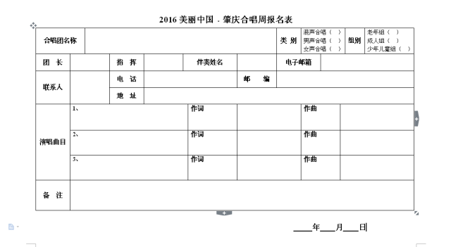 为进一步加强各地合唱艺术展示交流,推动合唱艺术事业繁荣发展,更好地传承中华优秀文化,弘扬主旋律,唱响中国梦,培育和践行社会主义核心价值观。中国合唱协会将与肇庆市人民政府联合举办“2016年美丽中国·肇庆合唱周”。现将有关事项通知如下: